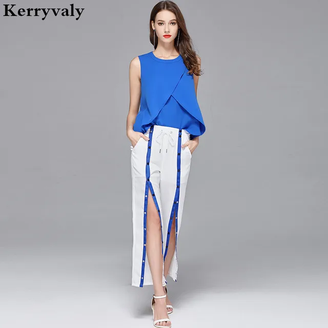 Cheap - High-end Summer 2 Piece Set Women Blue Tops + Leisure Open Leg Trousers Survetement Femme Marque 2018 Two-piece Suit D2036 Very Good