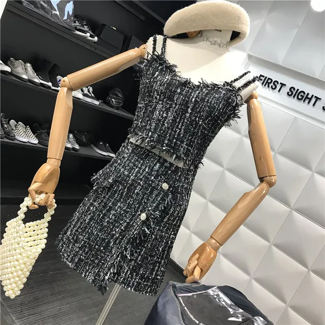 Special Price - Fashion 2018 Women Vintage Straps Slim Vest High Waist Tweed Skirt Sets Tassel Female Casual Backless Two-Piece Suits Very Good
