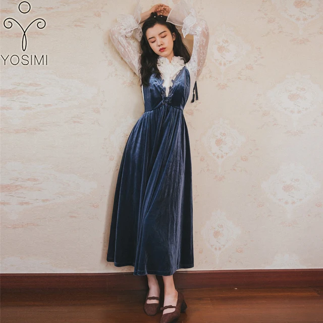 Special Price YOSIMI 2018 Autumn Winter Maxi Women Evening Party Dress Retro Blouse+ Velet Strap Dress Two-piece Suit Set Female Outfits