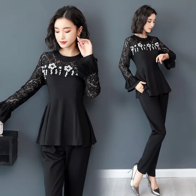 Special Price - Women's two-piece suit 2018 autumn fashion embroidery flowers hollow long-sleeved clothes + wild trousers pencil pants lace Very Good