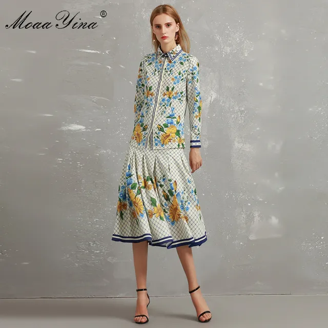 How Do I Get - MoaaYina 2018 Fashion Designer Runway Set Autumn Women Long sleeve Small yellow flower Elegant Shirt+Slim Skirt Two-piece suit Best Price