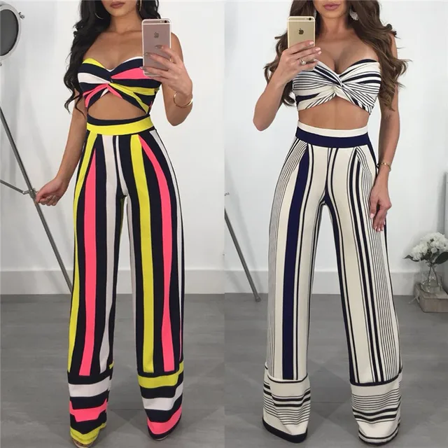 Clubwear Print Striped Two Piece Set Women 2018 Fashion Strapless Tops and Wide Leg Pants Suit Conjunto Feminino Party Jumpsuits Find Similar. US $22 Clubwear Print Striped Two Piece Set Women 2018 Fashion Strapless Tops and Wide Leg Pants Suit Conjunto Feminino Party Jumpsuits Macheda Summer Sexy Dress Women Wrapped Chest Red Belt