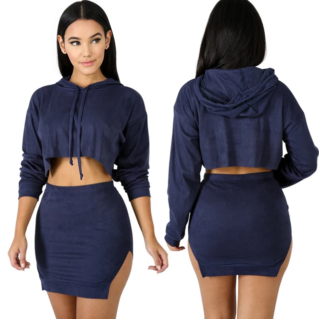 Buying - 2018 Autumn Hot Casual Sports Suit Sportswear Suit Solid Color Drawstring Hooded Sweater Slit Skirt Two-Piece Suit Women Clothes Cheap