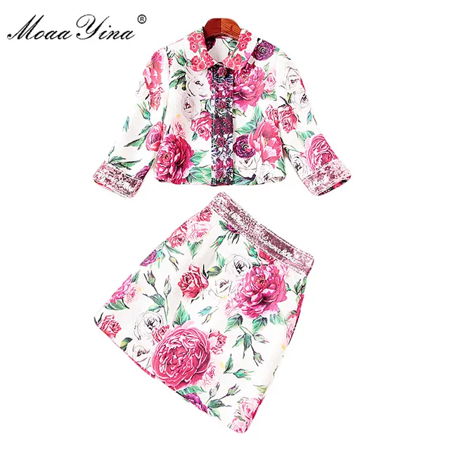 Buying - MoaaYina Fashion Set Spring Women 3/4 sleeve Floral Rose Print Applique loveliness Elegant Tops+Sequin Mini Skirt Two-piece suit Best Price