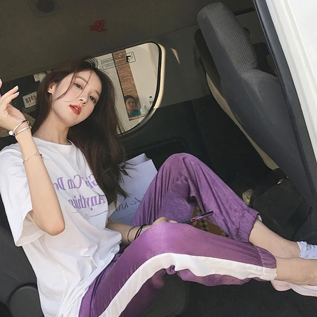 Sale - Hong Kong-flavored net red T-shirt top fitness and leisure nine pants two-piece suit purple color Special Price