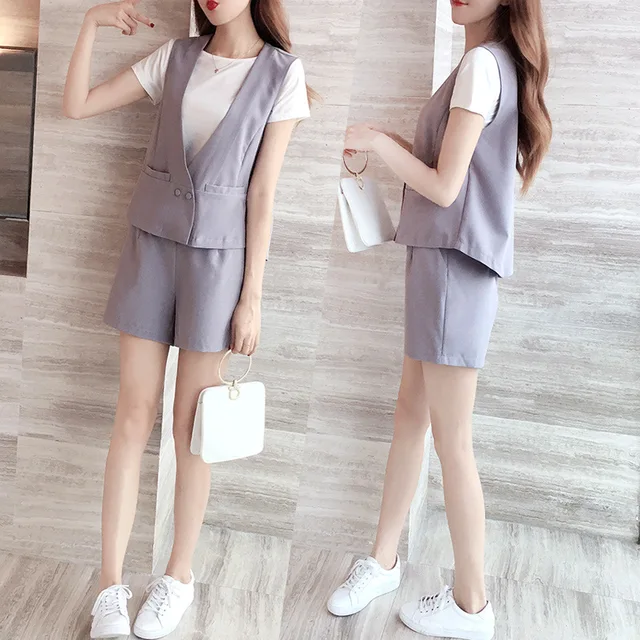 Compareand - Set female 2018 summer new temperament fashion sleeveless vest jacket + shorts elegant leisure two-piece suit ladies suit Special Price