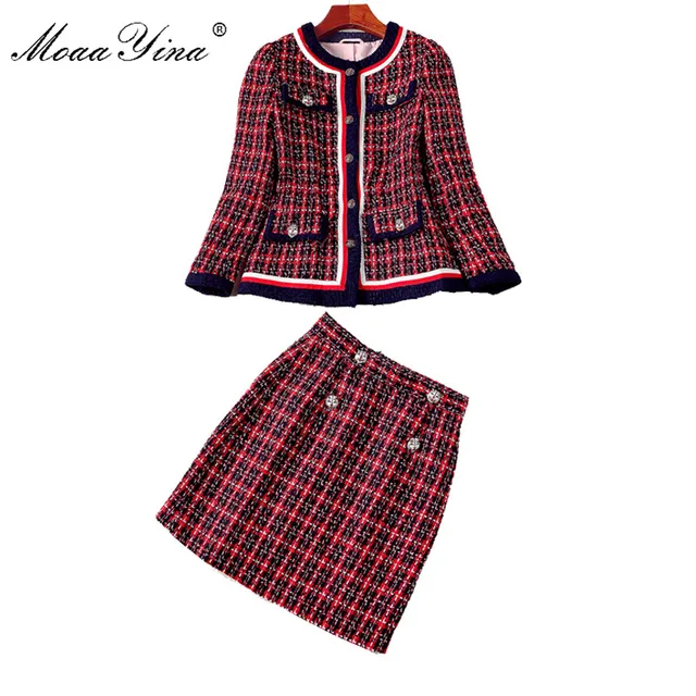 Cheap - MoaaYina Fashion Woolen cloth Set Autumn Women Long sleeve England Style Jacket jacket+Mini Skirts Elegant Plaid Two-piece suit Very Good