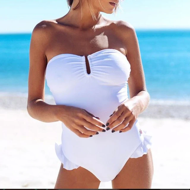 On Amazon (Yes Really) - Lace up white bikini women 2018 Bandeau ruffle swimsuit push up swimwear Sexy bodysuit high cut bathing suit new one-piece suits Special Price