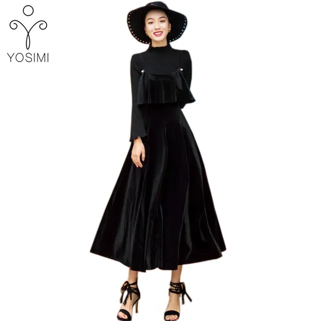 Online - YOSIMI 2017 Autumn Winter Women Fashion black dress High Quality Maxi Elegant Sweater+Velvet strap Long dress Two-piece Suit Set Best Offers