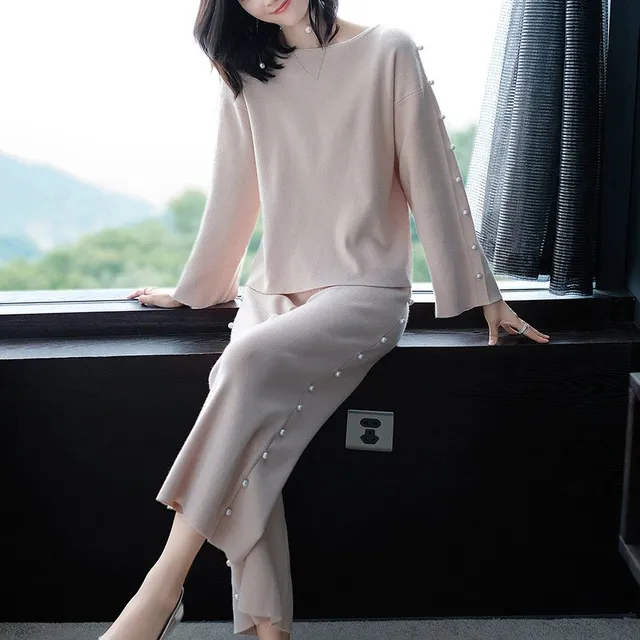 Cheap - Autumn And Winter Women's Loose Wide-Leg Pants Two-Piece Suit Pearls Noble Elegant Temperament Knit Clothing Wonderfull