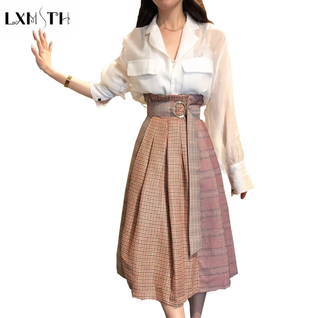 Best Price - KoHuiJoo 2018 Autumn Long Skirt Set Turu Down Collar Solid Perspective Shirt and Mid Calf Belt Skirts Two-piece Suit Fashion Wonderfull