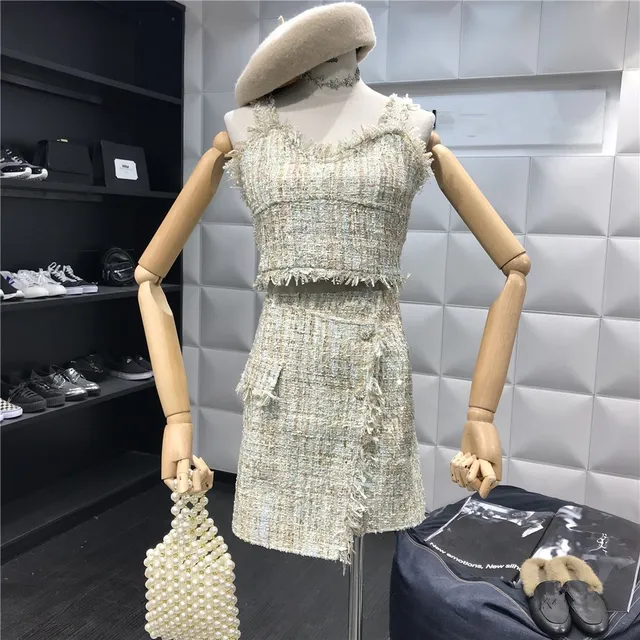 Cheap - Fashion 2018 Women Vintage Straps Slim Vest High Waist Tweed Skirt Sets Female Casual Backless Two-Piece Suits Very Recommended