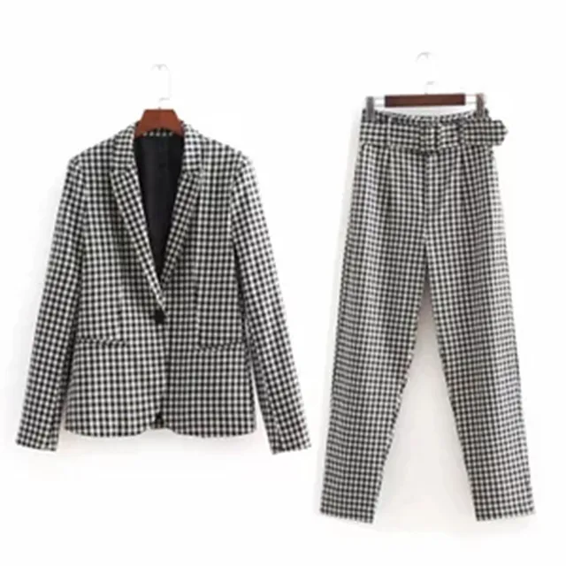 Discount - 2 piece set women check long sleeves one button blazer and high waist straight casual pants two-piece suit female autumn new Best Price
