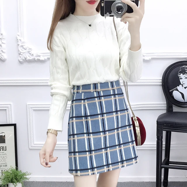 twist pullover sweaters women top knitwear Korean fashion sweater two-piece suit plaid print skirt vestidos lady femme design Find Similar. New autumn design fashion women's zipper stand collar long sleeve color block plaid print knitted top and short skirt twinset dress suit.