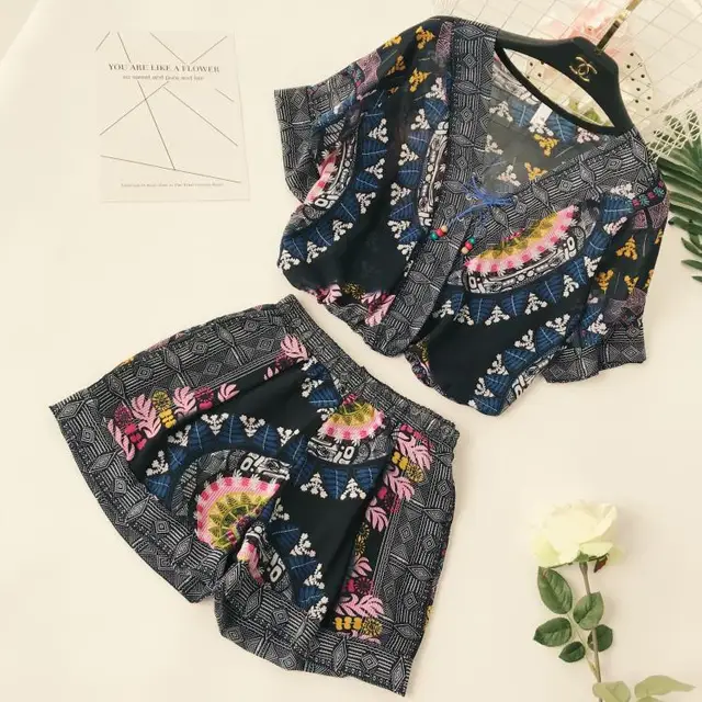 For Sale - 2018 fashion Women Fashion suit retro totem print V-neck loose blouse elastic waist wide leg shorts two-piece suit Best Offers