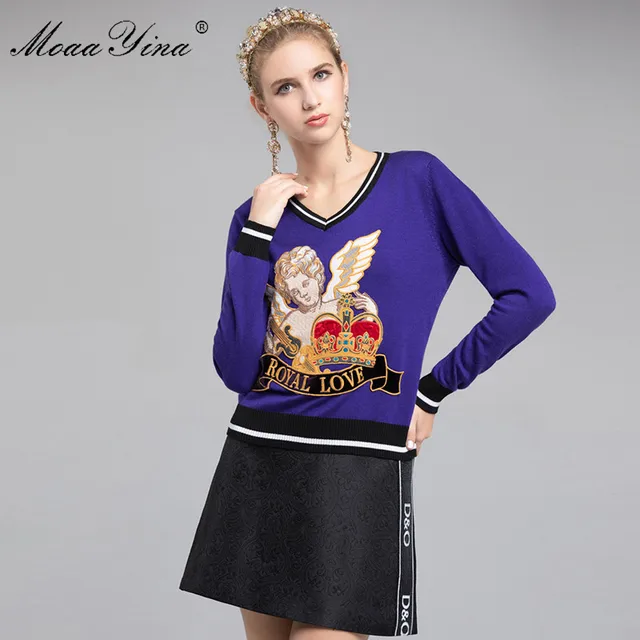 For sale - MoaaYina Fashion Designer Set Autumn Women Long sleeve V-neck Angel Embroidery Knitting Sweater+Sexy Short skirt Two-piece suit Cheap