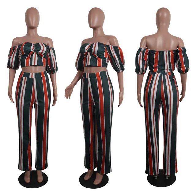How Do I Get - 2018 Summer New Women Striped 2 Piece Set Boho Backless Strapless Sexy Suit Half Slash Neck Lantern Sleeve Two-Piece Suit Cheap