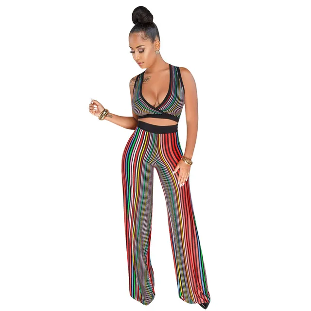Best Offers 2018 New Women Stripe 2 Piece Set Sleeveless Short Top Wide Leg Pants Sexy Outfit Deep V-neck Long Two-Piece Suit