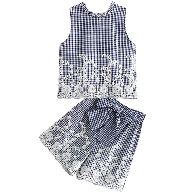 Price Compare - Set female 2018 summer new lattice sleeveless vest embroidered top + high waist wide leg shorts temperament two-piece suit Best Offers