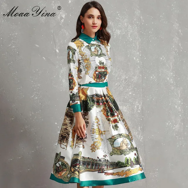 Cheap - MoaaYina Fashion Designer Set Spring Women Long sleeve Vintage Oil Painting Printed Elegant Blouse+Midi Skirt Two-piece suit Very Recommended