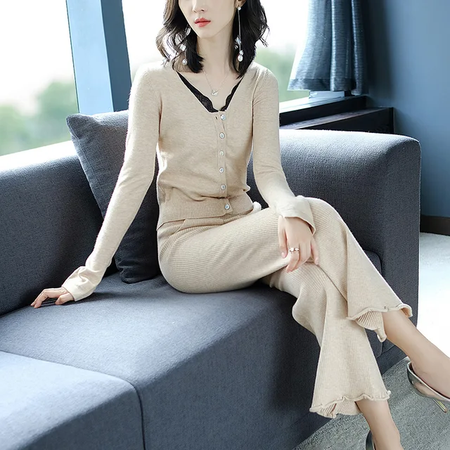 Affordable - Women's knit Casual Sets Autumn Winter Women Pant suits New Slim knit cardigan+Flare pants Knit Suit Fashionable Two-piece Suit Best Offers