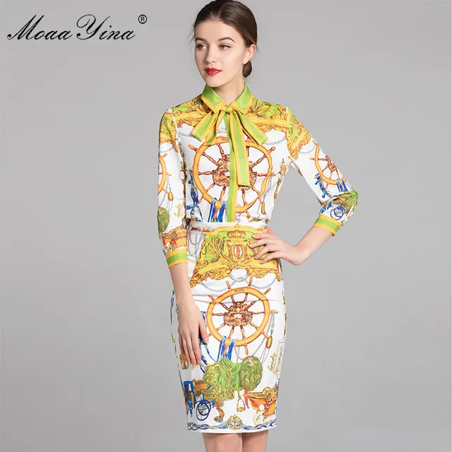 Bargain - MoaaYina Fashion Designer Set Spring Women 3/4 Sleeve Geometry Print loveliness Elegant Blouse+Packet hip Skirt Two-piece suit Best Offers