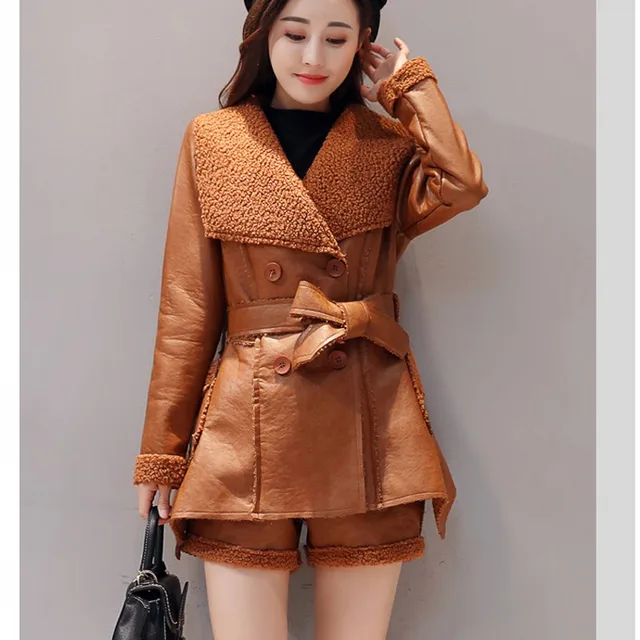 Cheap - 2019 autumn new casual fashion leather lamb hair women's long-sleeved solid color large size jacket and shorts two-piece suit Wonderfull