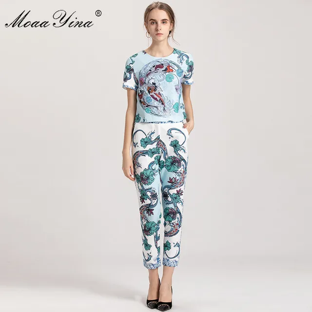 Best Price MoaaYina Fashion Designer Set Summer Women Short sleeve Goldfish Floral Print Elegant Blouse+3/4 Pencil pants Two-piece suit