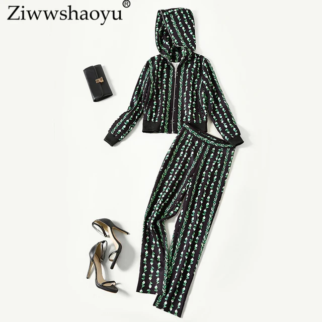 Best Price Ziwwshaoyu Europe and the United States 2018 autumn new suit Hooded Print Coat trousers casual two-piece suit