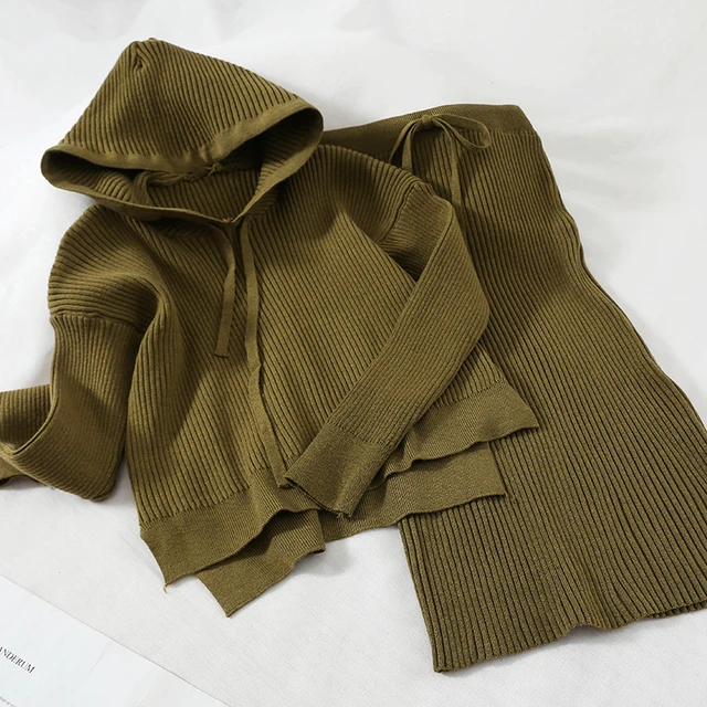 Compare Prices - 2018 new fashion women's two piece set hooded short sweater knit top +high waist long skirt two-piece suit female Cheap