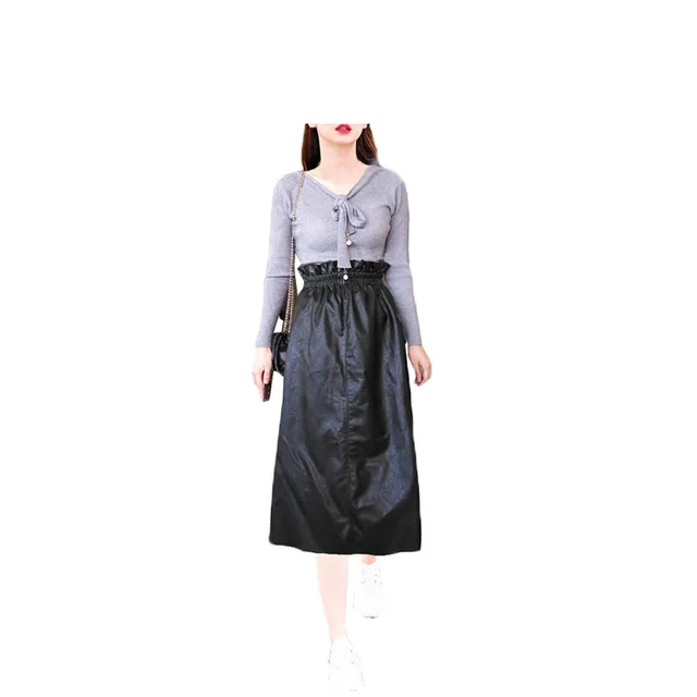 Special Offers - Women Two-piece suit Autumn ladies Set V-neck sweater+PU long skirts high quality women's suit slim fashion two piece set female Excellent